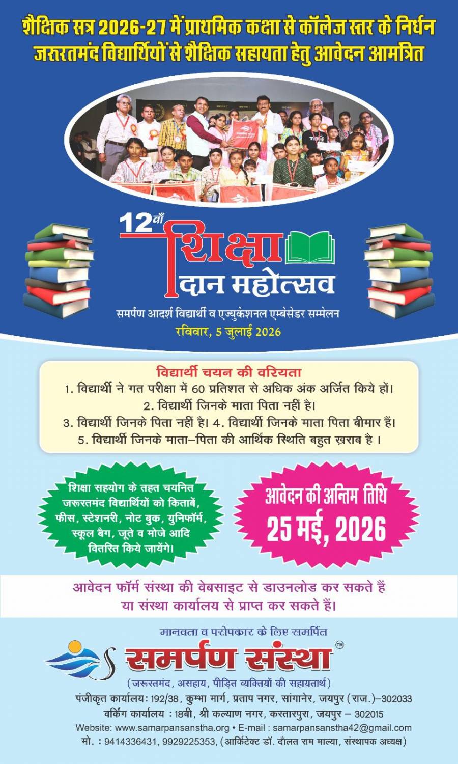 समर्पण संस्था का संक्षिप्त परिचय ..... जरूरतमंद ,असहाय व पीड़ित व्यक्तियों के लिए समर्पित समर्पण संस्था एक रजिस्टर्ड सामाजिक संस्था है जिसकी स्थापना नवम्बर, 2009 में की गई ।संस्था में सभी धर्म व जाति के व्यक्ति सदस्य है। संस्था के पदाधिकारी सदस्यों का सामाजिक क्षेत्र में एक स्थान व मुकाम है।संस्था की वर्तमान प्रबन्ध कार्यकारिणी ( 2023-26 ) में कुल 25 सक्रिय सदस्य है।कार्यकारिणी राजस्थान सरकार के सहकारिता विभाग में पंजीकृत है । समर्पण संस्था के रजिस्ट्रेशन…. 1. राजस्थान संस्था रजिस्ट्रीकरण अधिनियम 1958 के अन्तर्गत- 599/जयपुर/2009-10 2. सार्वजनिक प्रन्यास राजस्थान सार्वजनीन प्रन्यास अधिनियम 1959( 1959 का 42 ) के अधीन सहायक देवस्थान आयुक्त , देवस्थान विभाग , जयपुर खण्ड , जयपुर में रजिस्ट्रेशन- 139 जयपुर 2024 3. PAN Number - AAEAS2034F 4. TAN Number - JPRS29183A 5. 80G - AAEAS2034F25JP02(2027-28 to 2031-32 6. 12AB - AAEAS2034F25JP01 ( 2027-28 to 2036-37 ) 7. Niti Ayog - RJ/2022/0304490 8. CSR - CSR00034138 9. Udyam Registration Number ( MSME)-UDYAM-RJ-17-0117021 10. Sanstha Adhar Number ( SAN )- SAN 8006540118000110 11. VSDC ( Voluntary Sector Development Centre , Govt. of Rajasthan) Registration Number- VSDC/2023/JAIPUR/1105 12. Trade Mark number- 5311311 13. e-AUDAAN ( Ministry of Social Justice and Empowerment) NGO ID - RJ / 00036580